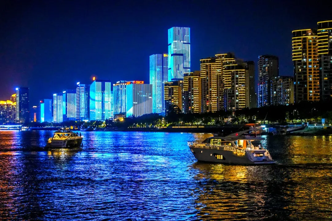 日落归山海,伴着晚霞的余韵,江面上是属于福州这座城市的流光溢彩。夜游闽江,看两岸繁华,尽赏榕城夜色之美。