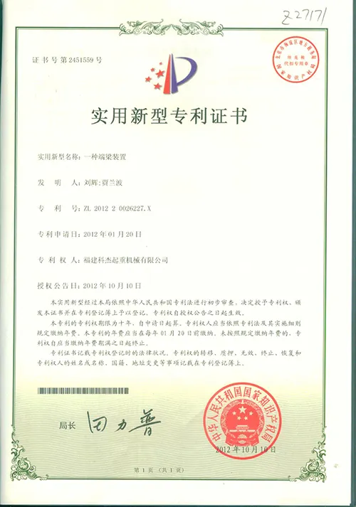 起重2014.08.06 证号3727244 新型单梁主梁联接装置 |